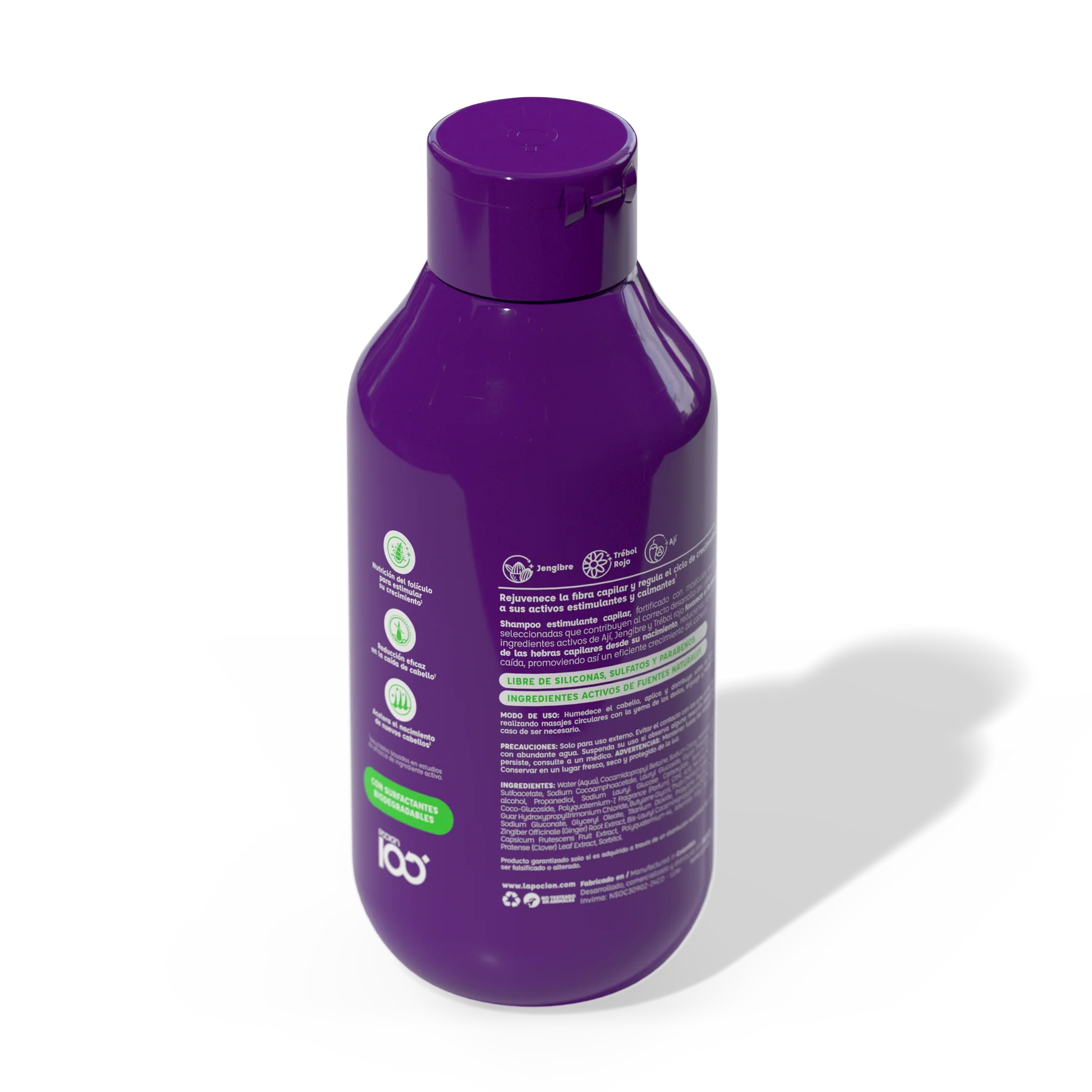 Shampoo Estimulante Crecimiento y Caída con tecnología bioactiva y alto índice de biodegradabilidad. La mezcla única de ingredientes naturales de Ají, Jengibre y Trébol Rojo revitaliza los folículos capilares desde la raíz, acelerando las fases de crecimiento capilar asegurando así, un crecimiento continuo y robusto al mismo tiempo que combate y detiene la caída del cabello.